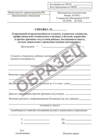 Справка удостоверяет факт заболевания студента, учащегося техникума, профессионально-технического училища, школы, является единственным документом, освобождающим его от занятий, для детей посещающих дошкольные учреждения – документом, удостоверяющим заболевание ребенка или карантин.